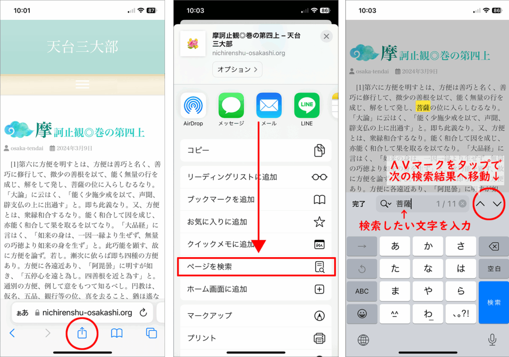 「ページ内検索」をタップすると文字入力できるようになるので、検索したい文字を入力します。